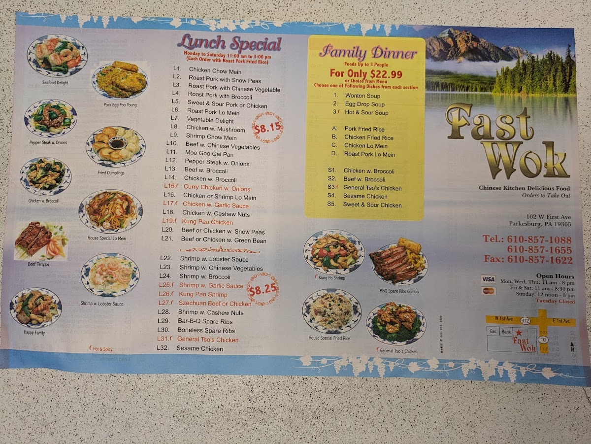 At Fast Wok, we celebrate the rich flavors of Chinese and Thai cuisine, all crafted with a personal touch by our dedicated family-run team. Located in the heart of Parkesburg, Pennsylvania, we pride ourselves on creating a warm and inviting atmosphere, making every dining experience feel like a gathering with friends. Our chef’s specials, like the Happy Family and General Tso’s Chicken, exemplify our commitment to quality and taste. Renowned for generous portions and exceptional service, we invite you to join our community of loyal customers who appreciate delicious food and a welcoming environment. Come taste the tradition and passion that make Fast Wok truly special!